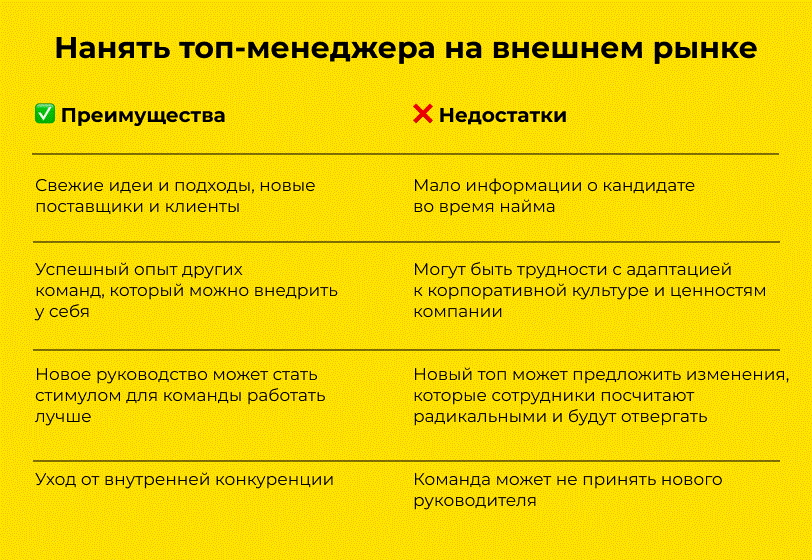 Есть два способа найма: найти соискателей на внешнем рынке или вырастить специалиста внутри компании на уровень топ-менеджера.